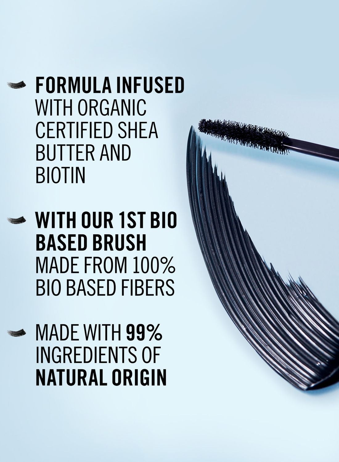 تركيبة نباتية معززة بزبدة الشيا العضوية المعتمدة والبيوتين مما يمنحك كثافة ترطيب للرموش تدوم طوال اليوم