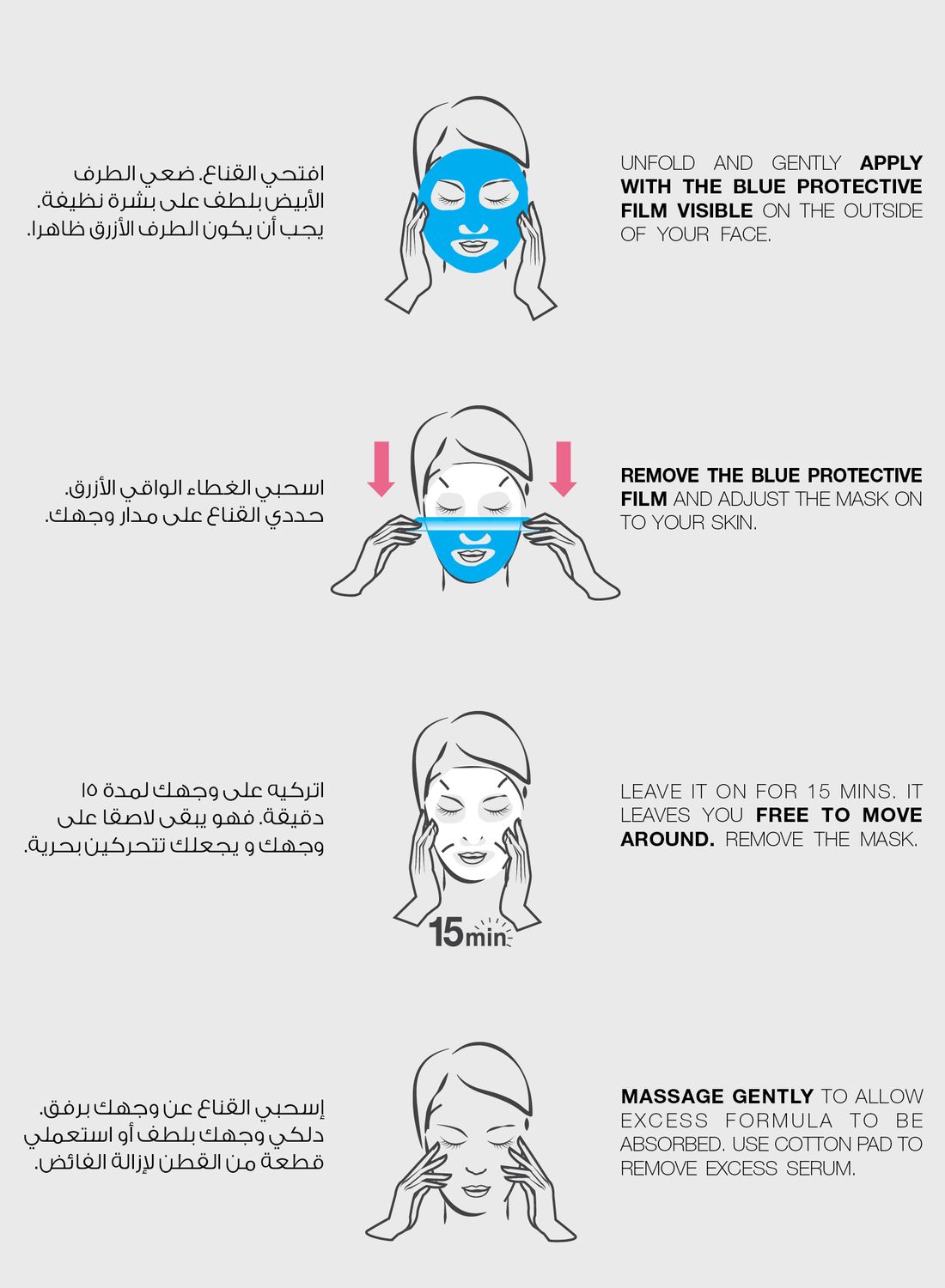 طريقة الاستخدام: افردي القناع. ضعيه برفق على وجه نظيف لتكون الطبقة الزرقاء الواقية على الجهة الخارجية من الوجه.